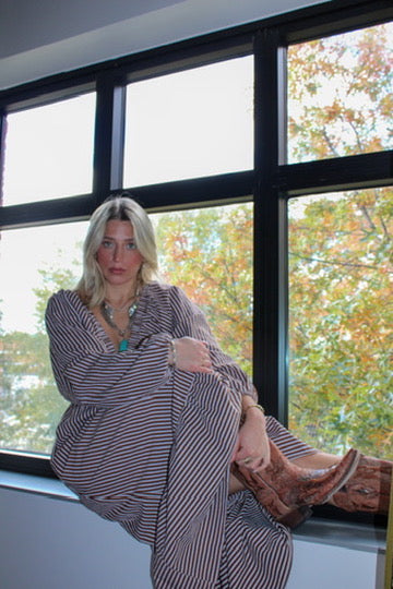 Introducing the Paige Dress! This cream-and-chocolate-brown maxi dress is easy to throw on in a hurry! Full length with a deep v-neck, you can easily dress it up or down.
